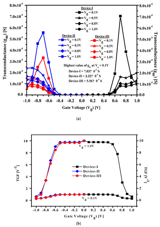 (a) The gm variation with Vg from 0.1 V to 1.0 V, and (b) TGF variation with Vg at drain voltages (Vd) = 0.1 V and 1.0 V for ‘Device-I’, ‘Device-II’, and ‘Device-III’.