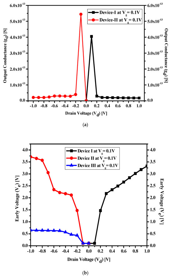The lowest value of gd is 1.77 × 10−14 S, which was measured for ‘Device-I’, as shown in Table 4. The smaller value of gd improves the analog performance parameters, such as the early voltage (Ve) and intrinsic gain (A) of devices. Figure 13a outlines the variation in gd with respect to Vd for Vg = 0.1 V.