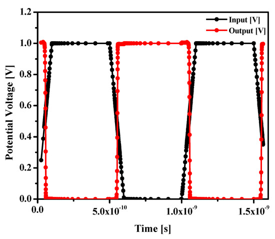Figure 14. Transient simulation plot of Inverter-1 at VDD 1.0 V. - Noise Margin: The noise margin determines the noise immunity of circuits, and this is indicated by NM [29]. The circuit with a higher value of NM shows high noise sensitivity. The expression for calculating NM for low signals (NML) and for high signals (NMH) is expressed as follows: