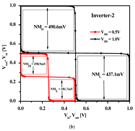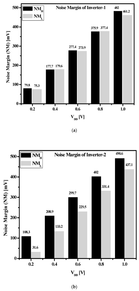 The lowest output value at logic level 0 is represented by VOL, and the highest output voltage at logic level 1 is represented by VOH [38]. Logic value 0 designates the lowest input voltage (VIL), while logic value 1 designates the highest input voltage (VIH). Figure 15 demonstrates the butterfly curve of Inverter-1 and Inverter-2 at supply voltage levels of 0.5 V and 1.0 V. The calculated noise margin values, i.e., NMH = 482 mV and NML = 461.2 mV of Inverter-1, are demonstrated in Figure 15a. Figure 15b displays the NM values for Inverter-2. The lowest output value at logic level 0 is represented by VOL, and the highest output voltage at logic level 1 is represented by VOH [38]. Logic value 0 designates the lowest input voltage (VIL), while logic value 1 designates the highest input voltage (VIH). Figure 15 demonstrates the butterfly curve of Inverter-1 and Inverter-2 at supply voltage levels of 0.5 V and 1.0 V. The calculated noise margin values, i.e., NMH = 482 mV and NML = 461.2 mV of Inverter-1, are demonstrated in Figure 15a. Figure 15b displays the NM values for Inverter-2. Inverter-2 has a 1.78% higher NMH compared to the NMH of Inverter-1 at 1.0 V, and a similar scenario was observed at 0.5 V, i.e., Inverter-2 had 11.85% more NMH compared to Inverter-1. Inverter-1 presents a larger value of NML at both voltages compared to Inverter-2, as shown in Figure 15. The butterfly curves and calculated NM values for the variable voltage VDD from 0.2 V to 1.0 V of the proposed inverters are displayed in Figure 16 and Figure 17, respectively. It has been analyzed in both inverters that a higher supply voltage results in a higher NM.