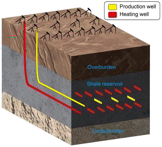Energy is a fundamental resource for the survival and advancement of human society. In recent years, global energy consumption has continued to rise, accompanied by a steady increase in oil prices, raising concerns about the sustainability of the world’s energy supplies. Due to their vast potential, unconventional oil and gas resources have become a key focus for many nations and energy companies [1,2,3]. Among them, oil shale, which is a kind of sedimentary rock enriched with solid organic matter, is believed to be the most promising unconventional energy resource. Oil shale resources are particularly abundant, with hundreds of deposits identified across 33 countries, containing an estimated 70 to 80 billion tons of resources. The “shale revolution” has enabled the United States to achieve energy independence, significantly reshaping the global energy landscape. However, extracting oil shale resources, especially low-maturity deposits with abundant macromolecular solid organic matter but little movable oil, poses significant challenges. To reduce extraction costs and enhance efficiency, in situ conversion technology is frequently employed for low-maturity oil shale deposits [4,5,6,7]. This technique employs methods such as electric heating to heat organic-rich shale formations at depths ranging from 300 to 3000 m. This heating process facilitates the physical and chemical reactions that pyrolyze organic matter into lighter hydrocarbons, making extraction more feasible and economically viable [8,9,10,11,12]. This study seeks to provide an in-depth examination of these challenges and propose effective strategies to enhance the extraction process. Figure 1 illustrates the schematic of the in situ conversion process in a horizontal well extraction system.