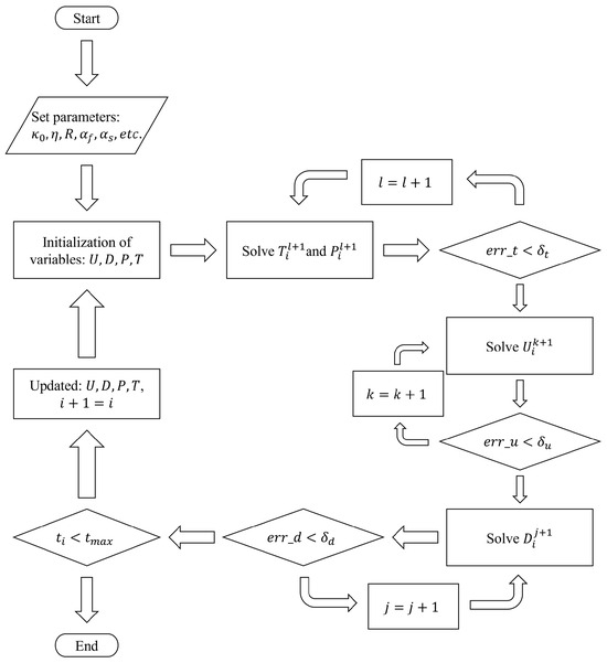 The finite element method is used to solve the established THMD model. To improve convergence, a segregated iterative scheme is utilized. Algorithm 1 presents the solution process of the segregated scheme for the in situ conversion process of the THMD model, where a second-order backward differentiation formula (BDF) and automatic time stepping are utilized. Figure 3 provides a flowchart illustrating the algorithm’s structure, offering a visual representation of the iterative solution process. We implemented the above algorithms in COMSOL.