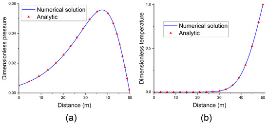 A comparison between numerical results and analytical results: (a) the dimensionless temperature varying with the longitudinal distance x (m); (b) the dimensionless pressure (Pa) varying with the longitudinal distance x (m).