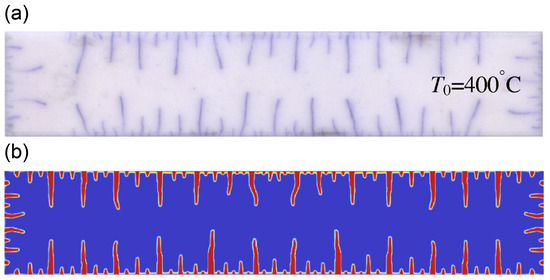 This section validates the model in accurately predicting the generation and evolution of thermal damage by comparing the numerical and experimental results of a quenching test of ceramic plates. In Jiang et al.’s experiment [38], ceramic plates with dimensions of 50 mm × 10 mm × 1 mm are heated to high temperatures ranging from 300 °C to 600 °C and quickly placed into water at 20 °C. After the cooling process, the plate is dried and dyed with ink to display the crack morphology. Considering the symmetry of the model, only half of the specimen is modeled, as shown in Figure 6. The size of the half model is 25 mm × 10 mm. The initial temperature is set as , and a prescribed temperature is applied on the top edge. Other parameters used in this simulation are summarized in Table 1. Figure 7 shows the crack morphology of numerical and experimental results after cooling down from . Overall, the crack growth on the boundaries exhibits uneven distribution and is inhibited at the corners. Long cracks that emerge along the longitudinal edges show almost equal spacing, and the long cracks are mainly distributed in the middle of the lateral edges, resulting from the cooling after high-temperature heating. As shown in Figure 7, the crack morphology obtained from the numerical simulation shows amazing similarity with the results observed in the experiment, which indicates the validity of the model in predicting thermal-induced damage evolution. Additionally, Figure 8 provides a bar chart comparing key parameters—crack numbers, crack length, and crack spacing—between the experimental and numerical simulation results, further reinforcing the model’s reliability in capturing detailed damage characteristics.