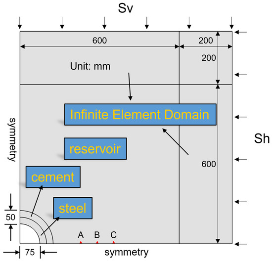 This section studies the influence of long-term thermal loading on the stability of the wellbore during the in situ conversion process. Due to symmetry, only one-fourth of the model is simulated when analyzing the heating process of a single well, as shown in Figure 9. The structure in Figure 9 consists of, from the inside out, a steel casing with an inner diameter of 150 mm and a thickness of 50 mm, followed by a cement sheath with a thickness of 50 mm, and then the oil shale reservoir. The outer layer is set to an infinite element domain to simulate the infinite boundary conditions. The model takes into account the influence of the initial reservoir pressure, with representing the horizontal in situ stress and representing the vertical in situ stress. Other parameters of the model are listed in Table 2.