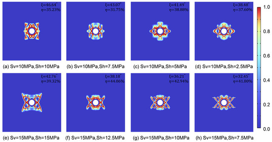 It can be seen in Figure 10 that as the difference between the horizontal and vertical in situ stress increases, the value of decreases, indicating that thermal damage tends to develop in the horizontal direction. When the in situ stress difference is the same, a higher in situ stress value corresponds to a greater degree of damage. As illustrated in Figure 11, an increase in the difference in stress results in a larger initial stress difference near the wellbore between the horizontal and vertical directions. Since shear failure is primarily caused by compressive stress, damage tends to propagate more horizontally. Higher in situ stress values lead to increased initial stresses in both directions, resulting in a more significant degree of damage and a more pronounced orientation.