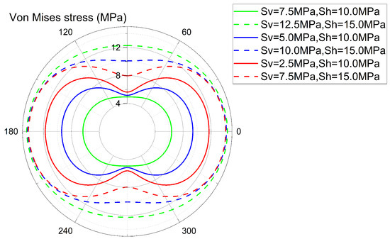 Polar coordinate diagram of von Mises stress around single well under different in situ stresses.