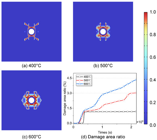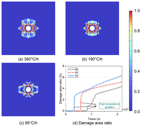 The influence of heating temperature is also studied in this section. It can be seen from Figure 13 that under the same heating rate, the stepped section ends at almost the same time, while for the case with the lowest heating temperature, the damage evolution stops after the step section ends. Higher temperatures result in larger temperature gradients, leading to greater thermal stress and more severe damage progression. In conclusion, the higher the heating temperature, the faster the damage evolution rate and the larger the damaged area.