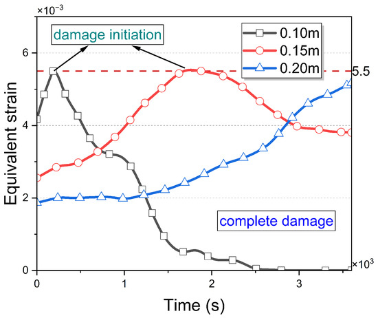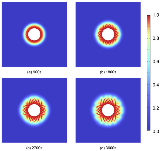 The damage caused by indirect heating is shown in Figure 17. Indirect heating means that the heating source does not directly act on the reservoir and the heat is transmitted to the reservoir through the steel layer and the cement layer. Compared with direct heating, the damage initiation time of indirect heating is longer, and the range of the damage area is significantly reduced. As shown in Figure 18, the damage point did not appear until 1800 s and the damage rate was still high after 2700 s. It can be seen that the selected points begin to be damaged only after 2700 s in Figure 18, and the damage is not complete until 3600 s. It can be seen that the symmetry, range, and rate of damage morphology are significantly affected by the wall material. A thicker cement sheath delays the onset of damage in the rock and reduces the overall extent of damage.