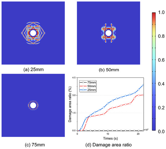 The damage morphology around a single heating well with different cement sheath thicknesses: (a) 25 mm. (b) 50 mm. (c) 75 mm. (d) Damage area ratio.