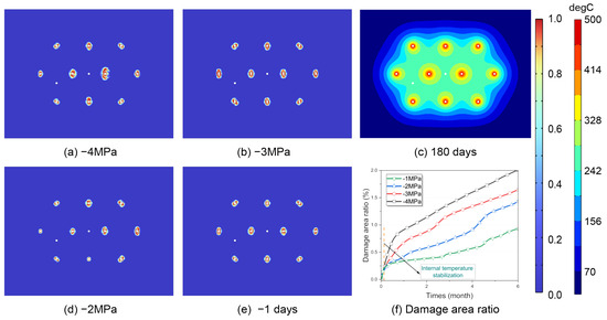 Damage area of well network model with different extraction pressures: (a) −4 MPa. (b) −3 MPa. (c) Reservoir temperature distribution in 180 days. (d) −2 MPa. (e) −1 MPa. (f) Damage area ratio.