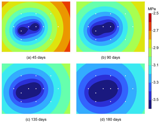 In recent years, there has been increasing attention on environmental protection, particularly regarding subsidence caused by the decrease in reservoir bearing capacity and pore pressure during the extraction process. Figure 23 presents the subsidence levels under different extraction pressures. After 6 months of drilling without extraction, the maximum subsidence recorded was 2.79 cm, which was due to damage in the reservoir. When the extraction pressure was set at −4 MPa, the maximum subsidence reached 6.35 cm after 6 months. The extraction process typically lasts for several years, during which the surface experiences continuous subsidence. This indicates that extraction pressure has a significant impact on surface subsidence.