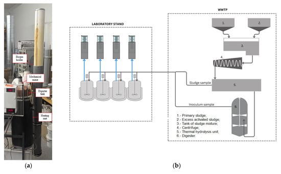 Figure 1 displays the schematic diagram of the experimental AD system used. The experiments were performed in batch mode and mesophilic conditions. The AD system consisted of four reactors, which were constructed using digestion tanks wrapped in heating mats and biogas collection tanks. All reactors were equipped with mechanical mixers with speed control (120 rpm). Additionally, the scheme is supplemented with visual representation of wastewater treatment plant, which was chosen to collect a mixture of primary and secondary sludge, and anaerobically digested sludge material (substrate and inoculum) for the AD experiment.