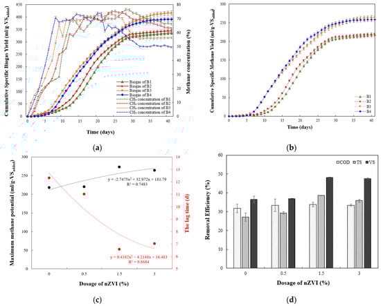 The experimental Cumulative Specific Biogas Yield (CSBY), CH4 content, Cumulative Specific Methane Yield (CSMY), kinetic parameters, TS, VS and COD removal efficiency results can be seen in Figure 2. The cumulative biogas and CH4 production in each reactor kept rising until it stabilized on the 41st day, indicating that digestion was complete. The maximum CSBY in the control reactor B1 was 336.1 mL/g-VSadded and much higher than compared to other AD studies with sewage sludge (132 mL/g-VS, 167 mL/g-VS) [42,69]. As can be seen from Figure 2a and Table 4, the CSBY for digester B2 was similar to B1 and reached 344.5 mL/g-VSadded after 41 d. However, with the addition of higher nZVI dosages, the biogas yields improved remarkedly. CSBY increased to 416.4 mL/g-VSadded (B3) and to 391.2 mL/g-VSadded (B4) (p < 0.05). The reactor B3 had the highest CSBY, which increased by 23.9% compared to the control. This falls in a range found in other studies, which showed that a nZVI dosage of 1 g/L resulted in increased biogas production up to 18.11% and 29.55% [70,71]. This shows that CSBY improved significantly at the higher doses of nZVI; however, it was slightly inhibited at a dose of 3%. Similarly, Jia et al. [70] found that a nZVI dosage of 1 g/L (what is equal to 1.5% nZVI concentration in this study) was optimal for biogas generation due to largest cumulative production, while 2 g/L nZVI concentration decreased biogas production up to 46.45% due to an inhibitory effect on methanogen activity. Therefore, it can be stated that high concentrations of nZVI particles can have a toxic effect on the AD of sewage sludge, as previously reported [45]. However, it can be noted that 3% of nZVI in this study did not indicate serious process inhibition, as the biogas/CH4 and VS removal values obtained were similar to a nZVI concentration of 1.5%.