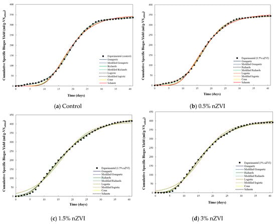 Experimental average cumulative biogas production results obtained at different nZVI dosages and their fit to eight sigmoidal models. The black dotted line represents the best-fit model.
