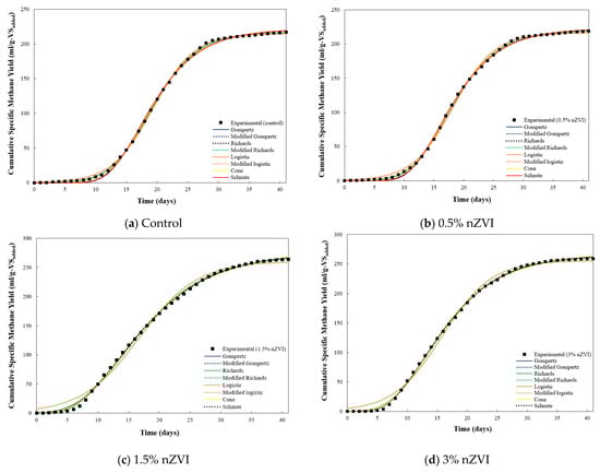 Experimental average cumulative methane production results obtained at different nZVI dosages and their fit to eight sigmoidal models. The black dotted line represents the best-fit model.