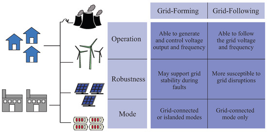In order to integrate RESs, battery energy storage systems (BESSs) to manage power generation and processing as well as power converters (able to change the form of electrical energy) are largely adopted. DC–DC converters play a crucial role in microgrids by managing voltage and current levels [22,23]. Since many renewable sources, such as photovoltaic (PV) panels and batteries, operate on DC voltage, DC–DC converters are needed to regulate and adapt their output to match the required voltage levels of the microgrid. These converters can be unidirectional, as in boost converters that step up solar panel voltage, or bidirectional, such as buck–boost converters used in BESSs to facilitate both charging and discharging. In DC microgrids, DC–DC converters are essential for maintaining stable voltage levels across different loads and sources, improving efficiency and reducing power losses. DC–AC converters, or inverters, on the other way, are responsible for converting DC power from sources like PV panels and batteries into AC power, which is required for most electrical loads and grid connections [24,25]. In microgrids, DC–AC converters often operate in either grid-following or grid-forming modes, ensuring synchronization with the main grid or establishing voltage and frequency in islanded operation. When operating as grid-following (GFL), as the name says, the power converters operate by synchronizing with the main grid voltage (reference) and injecting power accordingly [26,27]. They rely on a Phase-Locked Loop (PLL) to track the grid voltage phase and frequency to connect to the grid or even adjust the output current phase angle for changing the power factor [28,29]. On the other hand, when the power converters operate in grid-forming (GFM) mode, they do not rely on the main grid for synchronization. Instead, they actively regulate voltage and frequency, behaving like a traditional synchronous generator and providing a reference for other DC–AC converters. Additionally, these grid-tied inverters (GTIs) enable microgrids to export excess renewable energy to the main utility grid, enhancing energy efficiency and reliability. Figure 2 presents an overall comparison between grid-following converters and grid-forming converters.