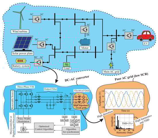Additionally, a major challenge in designing power converters is that even if the SCR is calculated for the electrical grid where the converter is connected, the real output impedance remains uncertain, as its value fluctuates in real time based on the voltage and current characteristics of the loads. In weak grids and similarly challenging scenarios, PLL-based synchronization algorithms become unstable, leading to oscillations and poor power quality [40,63]. Similarly, challenges arise when power converters operate in low-inertia systems. Low-inertia grids are those with significantly reduced rotational mass compared to traditional power grids. Additionally, inverters do not inherently contribute to system inertia, and the high penetration of renewable energy sources can degrade frequency stability, making grid control operations more complex. This issue is particularly common in microgrids, especially when operating in islanded mode, disconnected from the main grid, which typically relies on thermal power plants, hydroelectric systems, and other energy sources that provide high rotational inertia [64,65].