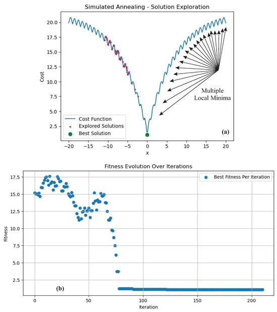 The SA technique was configured with the following parameters: an initial temperature of 50, a cooling rate of 0.95, and a maximum of 1000 iterations. The search space was constrained between −10 and 10. Figure 4 presents the solution exploration and the fitness function. It can be observed that the system converged approximately after 75 iterations, with the algorithm consistently refining its result by minimizing . Eventually, the global minimum was found at , where .