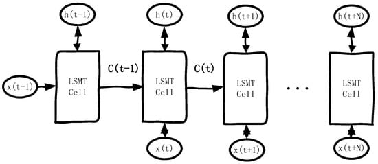 As depicted in Figure 1, LSTM cells process input data in each time step. Information is stored and propagated through the cell state c(t) and the hidden state h(t). The input for each time step, such as x(t − 1) for the time step t − 1 and x(t) for the time step t, is fed into the corresponding LSTM cell. The hidden state h(t) serves as both the output of the current time step and the input for the next time step and is updated in each step via gating mechanisms.