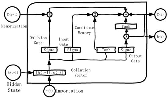 is the weight matrix of the oblivion gate, is the bias of the oblivion gate, is the Sigmoid activation function, and the output range is [0, 1]. The oblivion gate splices the hidden state of the previous time step and the input of the current time step to form a vector, linearly transforms the spliced input through the weight matrix and the bias , and uses the sigmoid activation function to map the result of the linear transformation to the range of [0, 1]. The output of the oblivion gate, , is a vector, and the oblivion gate can control which past information needs to be retained in the cell state in the current time step and which information needs to be forgotten.
