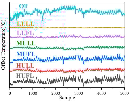 We selected 5000 sets of the above measurements as test data, which are shown and offset in Figure 4, where OT is the original top-oil temperature data, and LULL, LUFL, MULL, MUFL, HULL, and HUFL are the different characterization data.