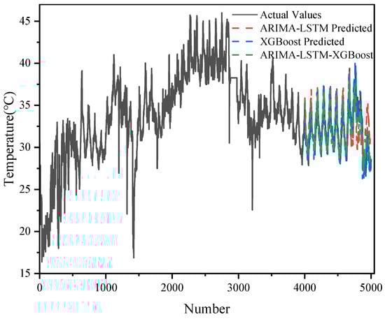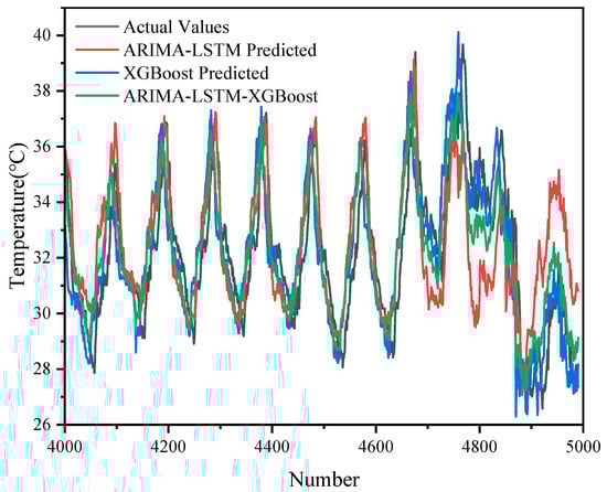 As shown in Figure 5 and Figure 6, the results of the prediction of 5000 sets of transformer oil temperature data by the three models (ARIMA-LSTM, XGBoost, and ARIMA-LSTM-XGBoost hybrid model) are demonstrated and compared with the actual oil temperature data (actual values). The graphs show the trend of the actual values with respect to the predicted values of each model.