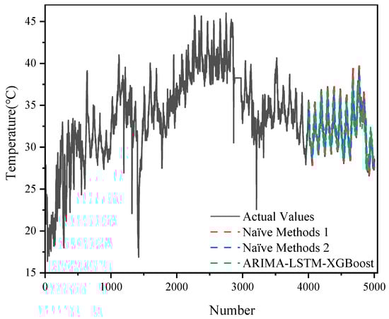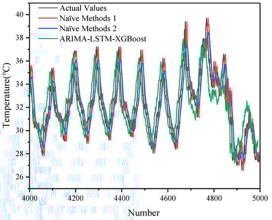 In addition, the experimental results incorporating the two naïve methods further emphasize the advantages of the hybrid model. For the 5000-data-point dataset, naïve method 1 and naïve method 2 yielded MSE values of 1.7370 and 1.6716, respectively, values that, while competitive in terms of computational efficiency, still fall short of the hybrid model’s MSE of 0.9908. Similarly, for the 500-data-point dataset, the naïve methods produced MSEs of 2.8611 and 2.9741, respectively, compared to 1.9174 for the hybrid model. These findings indicate that although naïve methods offer a valuable baseline by virtue of their simplicity and low computational burden, they lack the capability to fully capture the complex, dynamic behavior of transformer oil temperatures. By effectively integrating ARIMA’s linear trend modeling, LSTM’s nonlinear fluctuation simulation, and XGBoost’s strength in detecting intricate patterns, the ARIMA-LSTM-XGBoost hybrid model achieves significantly lower error metrics across various data scales, thereby establishing itself as a superior forecasting tool in both large-scale and small-scale prediction tasks.