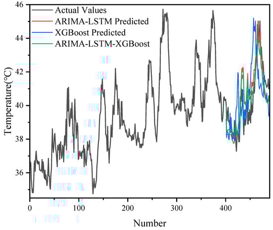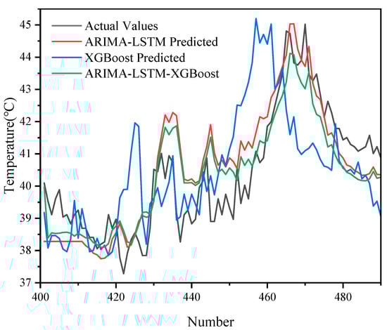The prediction results of different models (ARIMA-LSTM, XGBoost, ARIMA-LSTM-XGBoost) on 500 sets of data are demonstrated in Figure 9 and Figure 10, and it can be seen that the ARIMA-LSTM model captured the overall trend of the oil temperature better, but there was still some prediction bias in some periods, especially in the period of large fluctuations in the model. The prediction error of XGBoost was still more obvious in some periods with large fluctuations, and it could not follow the changes in the actual values accurately. The ARIMA-LSTM-XGBoost hybrid model had the highest prediction accuracy at all time points and could most accurately simulate the fluctuation in oil temperature data.