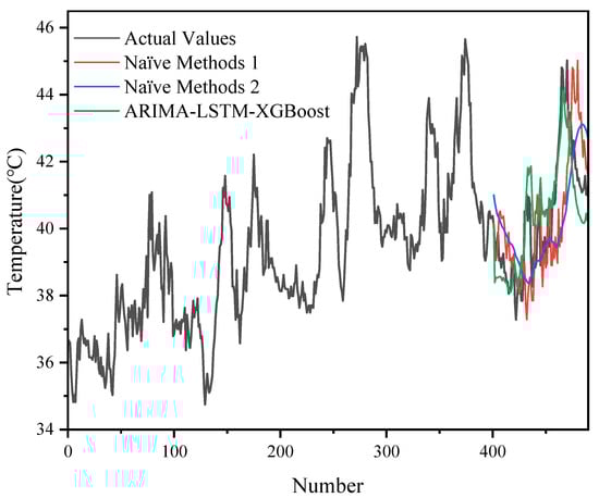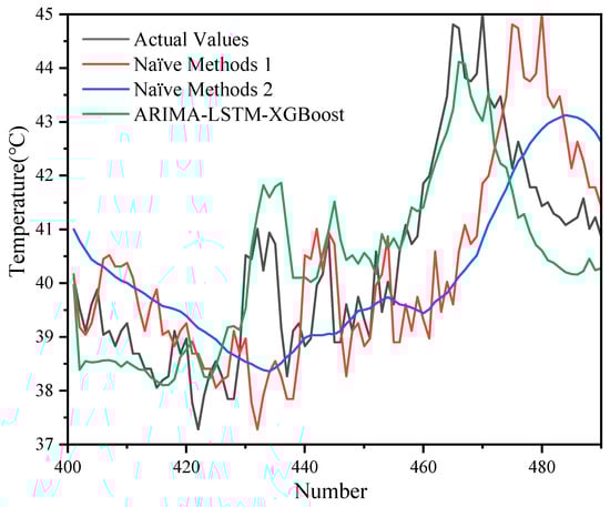 A comparison of prediction results between the naïve methods and the hybrid model with 500 sets of data.