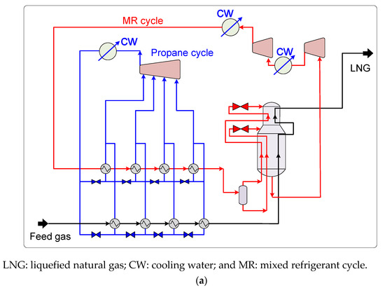 Figure 12 illustrates the SPC characteristics of various MFC-based LNG processes. According to the literature, the energy consumption of MFC-based LNG cycles is 0.196–0.423 kWh/kg LNG [18,24,51,58,154,165,166,167,168,169,170,171,172,173]. Also, a number of studies report that the exergy efficiency of MFC-based LNG processes is 51.8–62.8% [18,24,51,162,168].