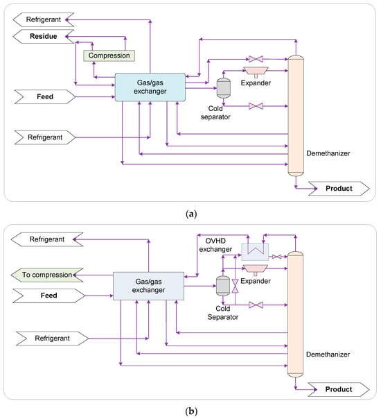 A decrease in pressure and temperature typically accompanies gas transmission through pipelines. These conditions can create an environment conducive to separating heavier hydrocarbons from the gas stream [16]. Heavier hydrocarbons, which possess a higher calorific value and are valuable in various conversion processes, are useful for domestic consumption and potential export commodities [17]. The feed gas is generally removed from heavier hydrocarbons (e.g., C2H6, C3H8, and C4H10, collectively referred to as NGLs) [18,19]. Efforts have been made to integrate the NGL recovery process with the liquefied NG (LNG) unit to minimize redundant equipment and leverage the benefits of a shared refrigeration system [19,20,21,22,23,24,25]. Following this treatment, the NG undergoes liquefaction through multiple stages of pre-cooling and sub-cooling, typically within compact but high-capacity plate-and-frame heat exchangers. The resultant methane-rich (CH4-) gas is then transferred to cryogenic storage tanks and maintained at or near atmospheric pressure, in preparation for transportation [26,27,28].