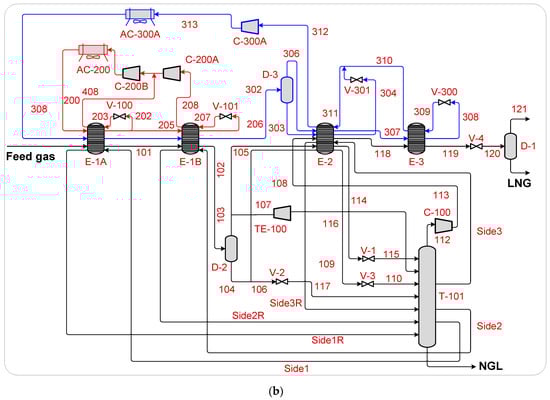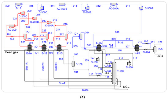An integrated structure combining NRU and LNG units was developed by Mehrpooya et al. [281]. The C3H8 refrigeration cycle is utilized for pre-cooling, while the multi-component refrigerant cycle is employed for liquefying the incoming feed. Figure 14 presents the process flow diagram of this cryogenic NG process. The analysis showed that the process achieved 41.27% exergy efficiency, with an exergy destruction rate of 89.90 MW. Exergy destruction and investment costs were categorized as avoidable–unavoidable and endogenous–exogenous [281]. The results revealed that both were mainly driven by internal factors, with minimal impact on exergy efficiency from component interactions. Exergy destruction costs in compressors were avoidable, while their investment costs were not. In contrast, exergy destruction in heat exchangers and air coolers was unavoidable, but their investment costs were avoidable.