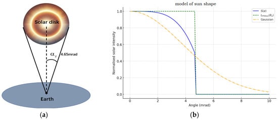 In Equation (1), S(α) represents the radiation flux at an emitting angle α, λ is a constant equaling 0.5138, and S0 indicates the maximum energy flux at the center. The solar cone angle αs is 4.65 milli-radians, as depicted in Figure 1. The solar radial flux density distributions of three models are compared in Figure 1b, where the blue curve represents the adopted sun shape model, the green dashed line represents the pillbox model, and the orange dashed line represents the Gaussian model.