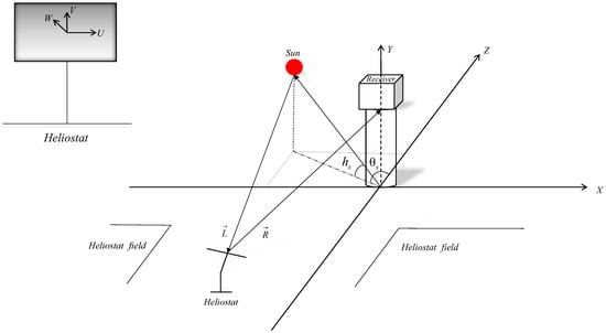 The coordinates of each heliostat and the aimed target were used to determine the normal direction of the reflecting surface of the heliostat at a specific time. The modeling of the sun tracking process involves three coordinate systems, namely the global coordinate system, the heliostat coordinate system, and the receiver coordinate system, as shown in Figure 2. The global coordinate system takes the east as the X axis, north as the Z axis, and the zenith as the Y axis. The origin of the global coordinate system is located at the bottom of the tower.