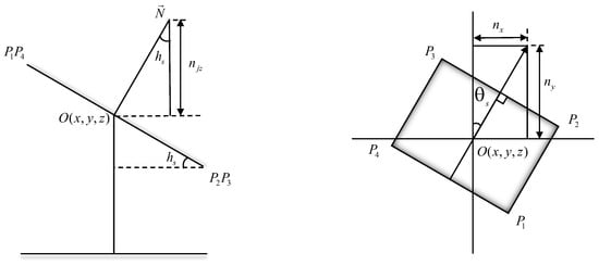 Assume that is the normal vector of the heliostat’s surface. The angle between and the zenith is the heliostat’s elevation angle . Figure 4 (left) is a side view of the heliostat. The elevation angle can thus be expressed as in Equation (5), where is the Z coordinate of in the heliostat coordinate system. Figure 4 shows the side and top views of the heliostat.