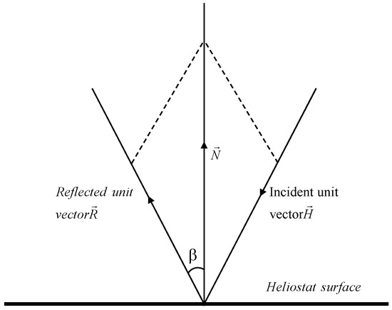 During the ray tracing process, directional rays are generated and sampled according to the distribution of the light source. The rays pass through the atmosphere and arrive at the heliostat and are then reflected by the surface onto the receiver atop the tower. Because the normal vector of the heliostat is known, for each generated ray, the corresponding reflecting ray can be obtained on the basis of the principle of symmetry for mirror reflection, as shown in Figure 5.