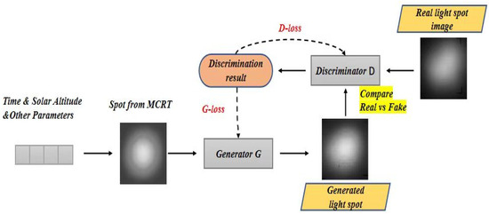 Generative adversarial networks have achieved great success in image generation and many other fields [24,25]. A typical GAN consists of a generator network that produces samples and a discriminator network that discriminates the generated fake sample from the real sample. In this approach, the simulation result at a certain time produced by MCRT is used as the condition. The previously captured light spots on the Lambertian target concentrated by the heliostat are used as real samples of solar flux distribution. A conditional GAN model can then be trained for the prediction of the concentrated solar density distribution formed by the heliostat, as shown in Figure 6. The concentrated light spots on the Lambertian target were captured using a calibrated camera. These images contain full information on the surface geometry as well as the reflectivity attributes of the specific heliostat, and therefore provide efficient data for learning and modeling.