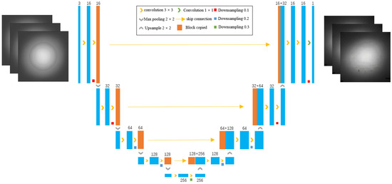 The framework of Pix2Pix, a well-known cGAN model, was used in this research. The generator network of Pix2Pix is a UNet, as shown in Figure 7. By directly linking the encoder and decoder pairs in the network, the skip connections in the UNet can preserve the features of different levels.