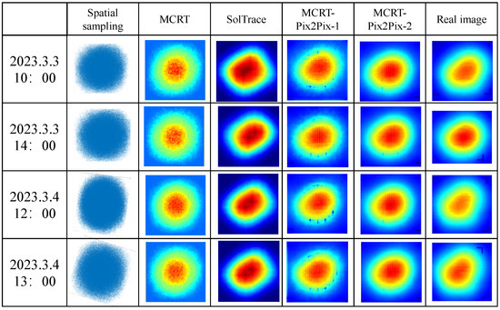 Two MCRT-assisted GAN models were trained: MCRT-Pix2Pix-1 using original MCRT images, and MCRT-Pix2Pix-2 using smoothing-filtered MCRT images. Both models showed similar performance during testing, as shown in Figure 9, which compares images generated from point clouds, MCRT, SolTrace, and both GAN models at four times (different from the training data’s date), along with captured images of concentrated solar spots on the Lambertian target.