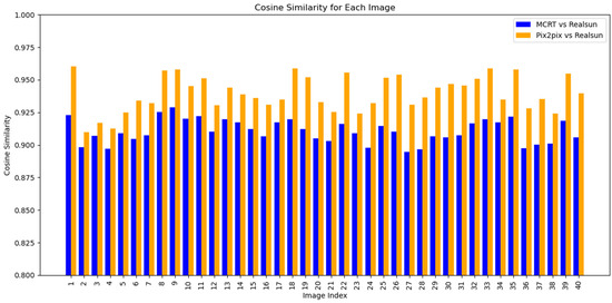 The average cosine similarity between the simulation result and the real images was 0.91, whereas the average cosine similarity between the images generated with MCRT-Pix2Pix and the actual images was approximately 0.94. Both groups were high, but the MCRT-Pix2Pix images were consistently better than those of the MCRT group for all test samples, as illustrated in Figure 11.