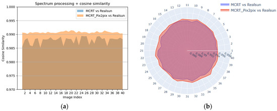 In the spatial frequency domain, MCRT_Pix2Pix achieves a higher average value in terms of cosine similarity than MCRT. In addition, the MCRT_Pix2Pix group has much less fluctuation in terms of spectral cosine similarity, as illustrated in Figure 12a. Comparisons of the cosine similarity of the central 64 × 64 pixels’ part of the spectrum (the low-frequency part of the spectrum), as shown in Figure 12b, also demonstrate that the images generated with MCRT-Pix2Pix are highly consistent with the real images, with the spectral cosine similarity reaching 0.9958.