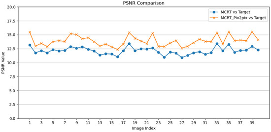 The PSNRs between the generated images and real images were also calculated for both MCRT and MCRT_Pix2Pix. The results are shown in Figure 13. The PSNRs for both groups were not high due to the low contrast of concentrated spots. Nevertheless, the average PSNR of the generated images from MCRT_Pix2Pix was approximately 13.91 dB, which was obviously higher than the average PSNR value of the MCRT group (approximately 12.13 dB).