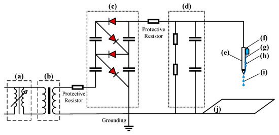 Test arrangement schematic. (a) Voltage regulator; (b) test transformer; (c) DC high-voltage generator; (d) voltage divider; (e) rod electrode; (f) reservoir; (g) tube; (h) control valve; (i) water droplets/streams; (j) plane electrode.