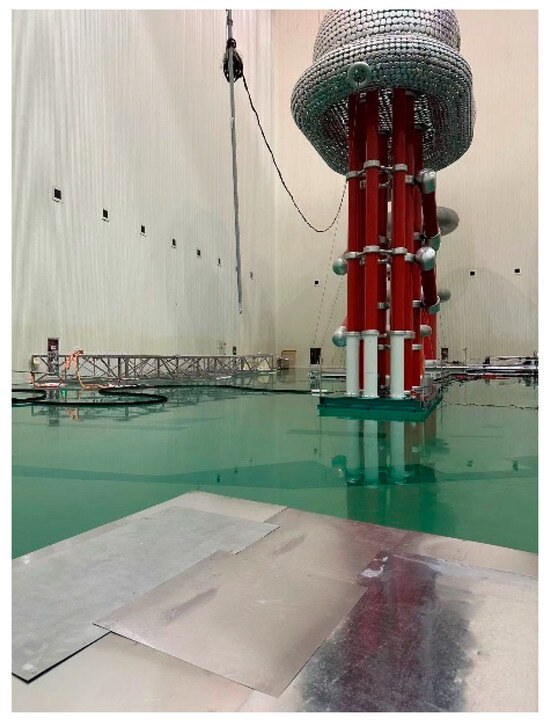 The test platform employed in this study is depicted in Figure 1, with Figure 2 providing a detailed physical illustration. The DC power supply utilized features a rated voltage of ±600 kV and a rated current of ±500 mA. The primary circuit of this power supply comprises a single-sided voltage-doubling configuration, incorporating a coupling capacitance of 300 pF. The rod–plane electrode arrangement facilitates the generation of a highly inhomogeneous electric field. The rod electrode measures 1.5 m in length, while the plane electrode spans an area of 3 m by 3 m.