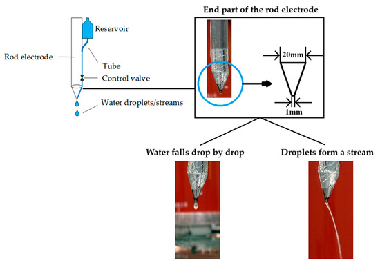 The difference between this test and the conventional rod-plane gap discharge test arrangement is that a water drip device is installed on the rod electrodes to simulate the situation during rainfall. Different water droplet patterns can be simulated at the tapered end of the rod electrode for heavy and light rain by adjusting the control valve. In this work, the results of the tests at two different flow rates (the flow rate of the water droplets falling from the rod electrode) were used for comparative analyses, which are 0.12 mL/s (individual drops at the tapered end of the rod electrode) and 1.2 mL/s (continuous stream at the tapered end of the rod electrode), respectively. The choice of flow rate was governed by two primary considerations: Firstly, the control valve (in Figure 1) employed in the experiments possesses a restricted adjustment range. Secondly, the principal aim of this test is to examine the effects of water droplets on the gap. Notably, the droplet morphology at the rod electrode differs significantly between flow rates of 0.12 mL/s and 1.2 mL/s, effectively mirroring the distinction in gap behavior under light rain versus heavy rain conditions. The dimensions of the tapered end of the rod electrode and water droplet morphology at different flow rates are shown in Figure 3.
