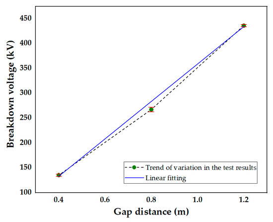 Based on the theory of gas discharge and the outcomes of numerous air gap discharge tests, it has been established that the breakdown voltage and gap distance exhibit a roughly linear relationship within a 10 m gap distance under DC voltage, with the average breakdown field strength for rod–plane gaps being approximately 4.5 kV/cm [19]. In the present study, the variation curves of breakdown voltage with respect to gap distance are presented in Figure 4. These curves were obtained under conditions where the flow rate of water dripping from the rod electrode was maintained at 0.12 mL/s and the conductivity of the simulated rainwater was 55 mS/cm. The solid line in Figure 4 illustrates the trend of linear fitting, whereas the dashed line depicts the trend of the actual experimental results.