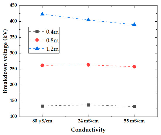 The results presented in Table 1 illustrate that the breakdown voltage is influenced by the drip rate when water droplets are present at the rod electrode. As the drip flow rate at the rod electrode increased from 0.12 mL/s to 1.2 mL/s, the breakdown voltage of the gap exhibited an average decrease of approximately 2.29% across three different gap distance conditions. Furthermore, the impact of the drip flow rate on the breakdown voltage seems to intensify with the increase in gap distance. It is important to highlight that the conductivity of the water utilized for the tests in Table 1 was approximately 80 μS/cm.