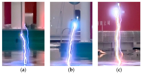Typical breakdown morphologies at 3 gap clearances for a dripping rod–plane air gap. (a) Air clearance of 0.4 m; (b) Air clearance of 0.8 m; (c) Air clearance of 1.2 m.