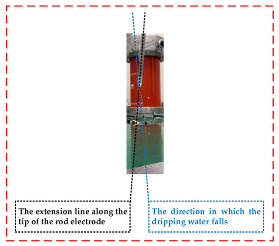 Figure 6 illustrates that in the presence of dripping at the rod electrode, two distinct breakdown paths emerge across the gap. The primary discharge path initiates at the tip of the rod electrode, while a secondary breakdown path may develop at the point of water droplets formation, situated above the electrode’s tip. Owing to the installation of the counterweight, the actual rod electrode used in the tests presented in this paper is not perfectly perpendicular to the plane containing the plane electrode. Consequently, when a water droplet falls, its trajectory exhibits an inclination relative to the extension line aligned with the tip of the rod electrode. This scenario is depicted in Figure 7. Simultaneously, under ideal conditions, the water-storage bottle mounted on the rod electrode is designed to be connected via a flexible hose, directing the water to drip precisely from the electrode’s tip. Nonetheless, in practical terms, leakage may occur at the junction between the hose and the storage bottle, potentially causing dripping to happen above the electrode’s tip. This phenomenon further elucidates the emergence of the second breakdown path across the gap, as depicted in Figure 6. In real-world power engineering scenarios, raindrops during precipitation can descend from various positions, not necessarily at the point of minimum electrical distance, yet still pose a risk of insulation failure.